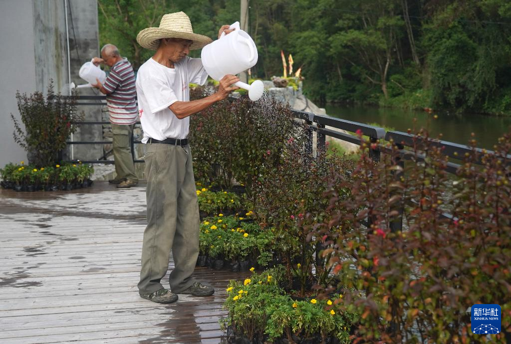 村民给景观道边的绿植浇水(8月24日摄)。新华社记者 万象 摄pagebreak