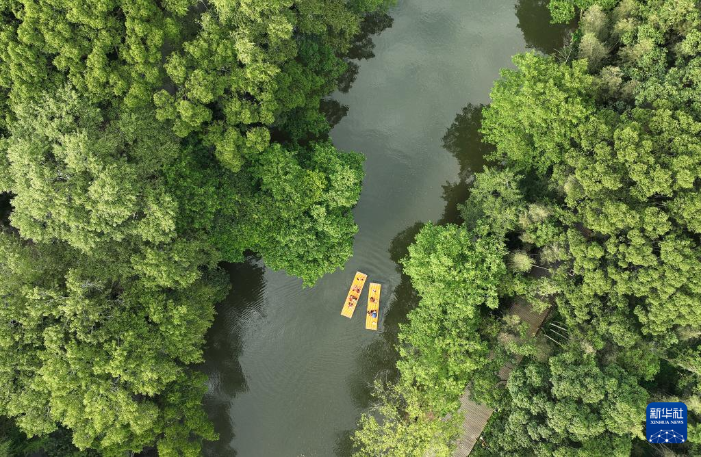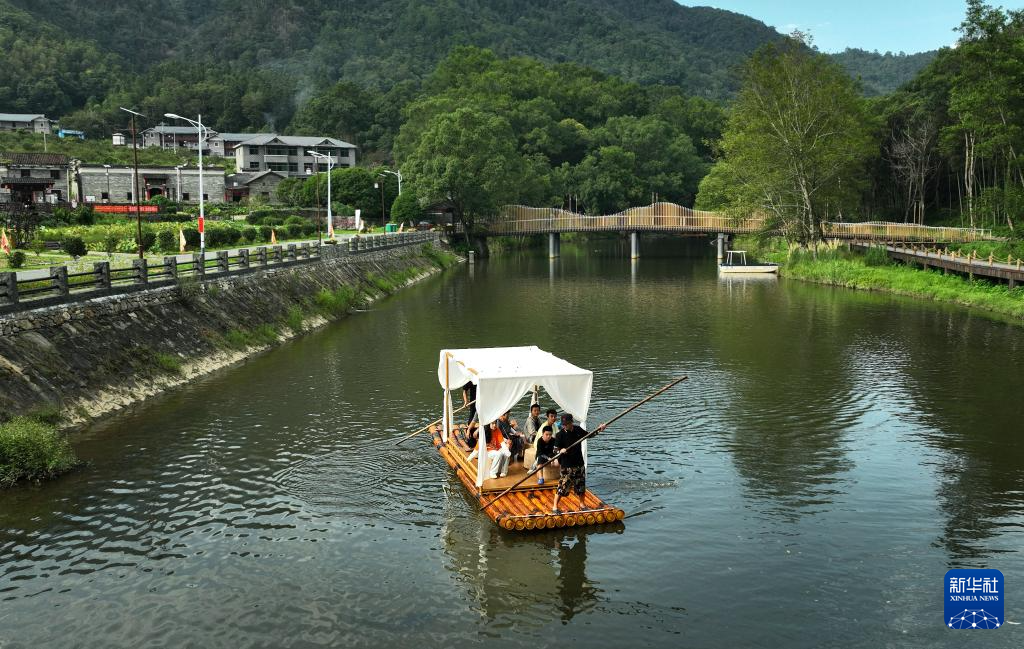 游客在港背村的小溪里体验竹筏漂流(8月24日摄,无人机照片)。新华社记者 万象 摄pagebreak