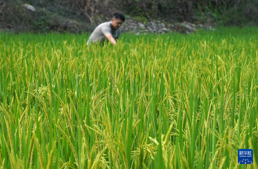 包希孟查看农业体验区里水稻生长情况(8月24日摄)。新华社记者 万象 摄pagebreak