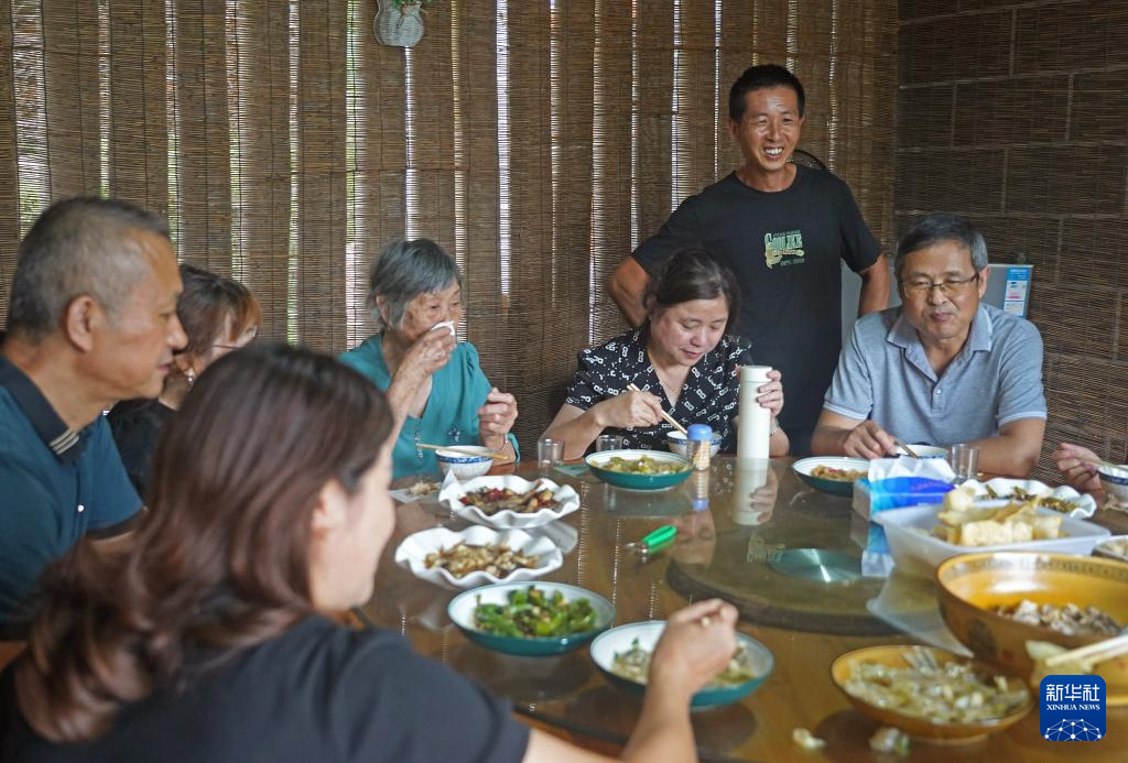 村民吴竹华(右二)招待来农家乐用餐的游客(8月24日摄)。新华社记者 万象 摄pagebreak