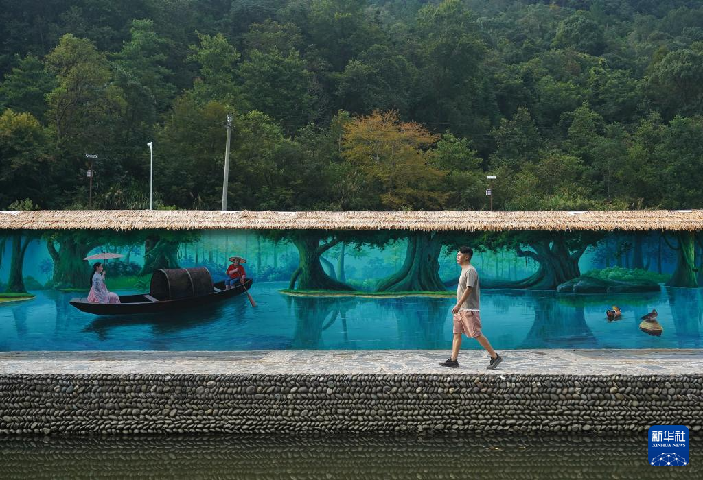 包希孟从生态泳池边的彩绘墙前走过(8月24日摄)。新华社记者 万象 摄