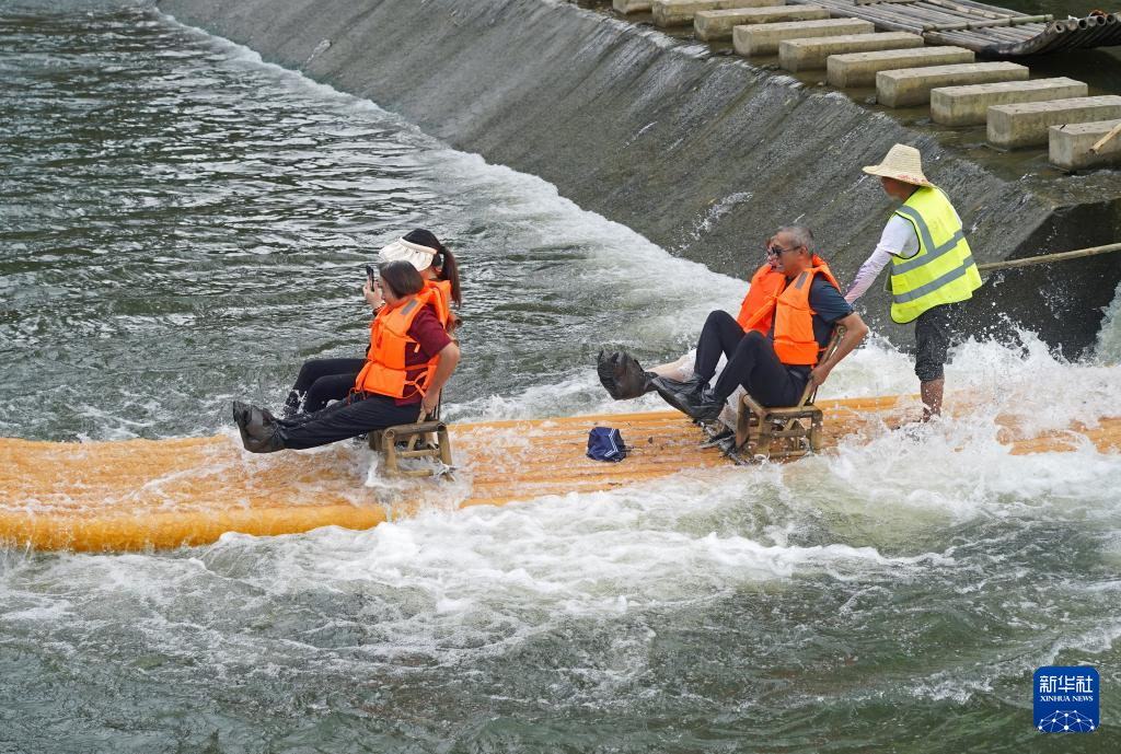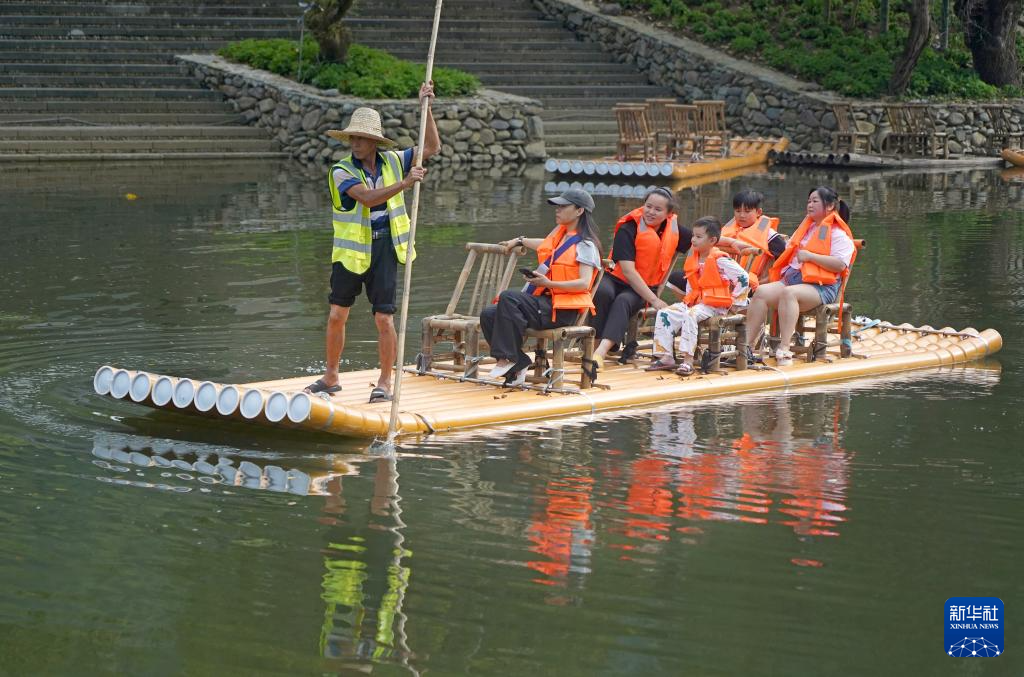 游客在港背村的小溪里体验竹筏漂流(8月24日摄)。新华社记者 万象 摄pagebreak