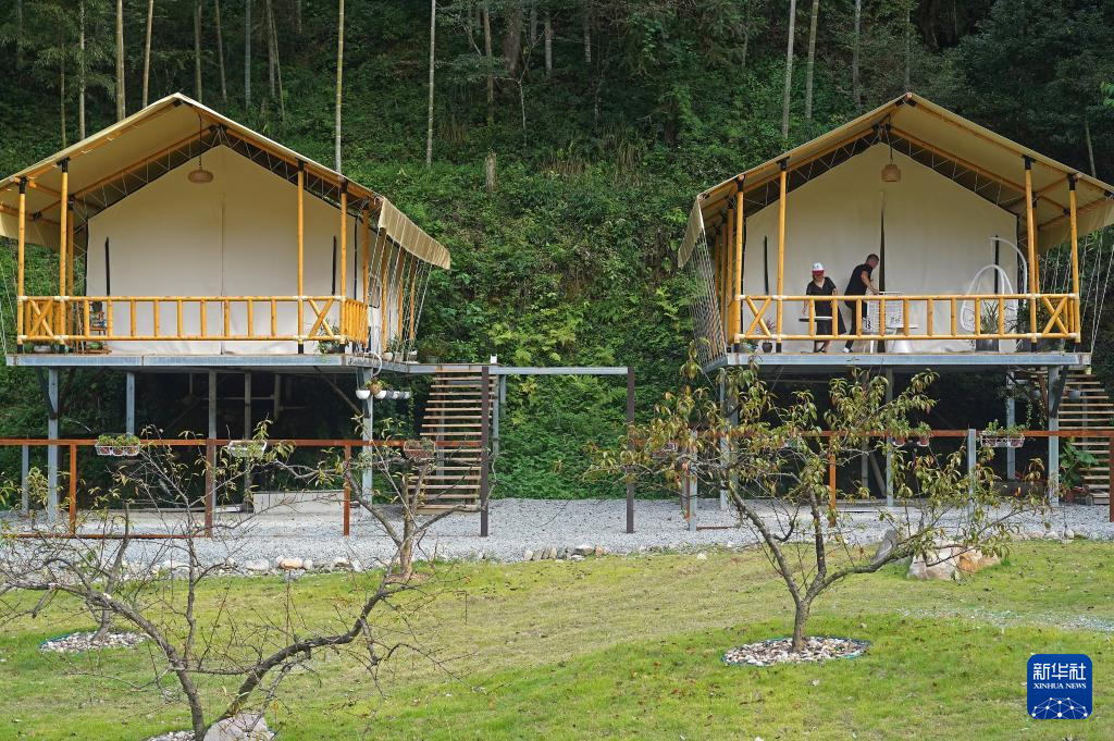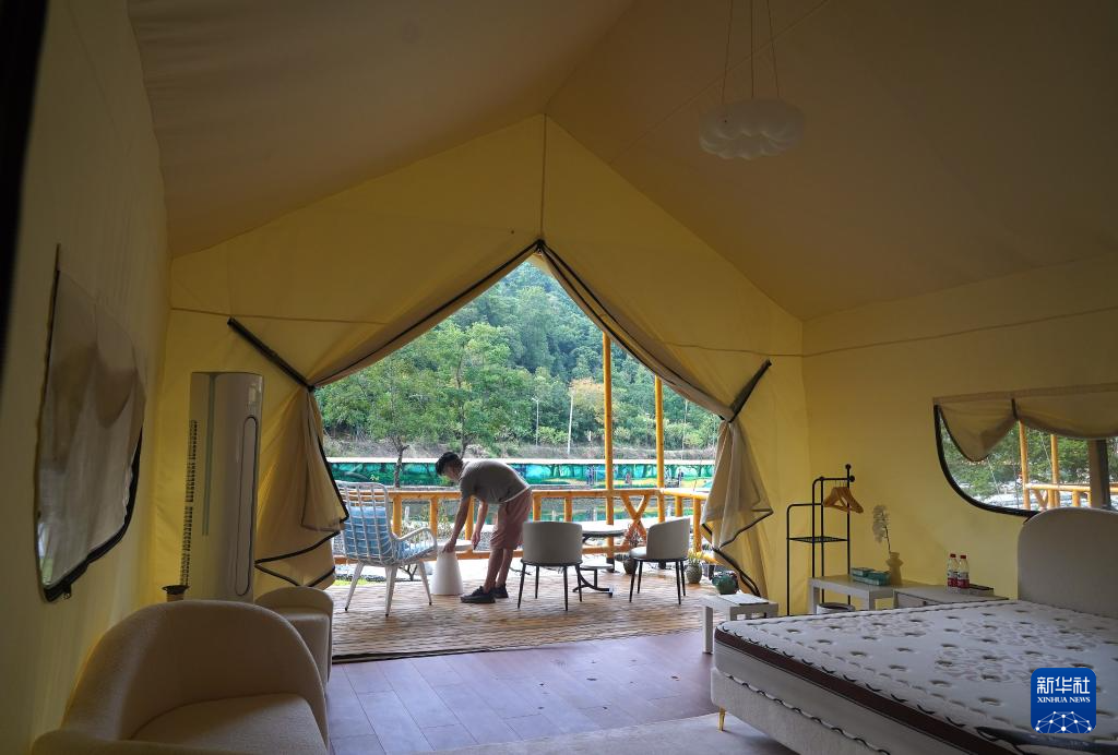 村民在打扫户外帐篷,港背村玛瑙岩森林小镇的户外帐篷营地不久后将对外开放(8月24日摄)。新华社记者 万象 摄pagebreak