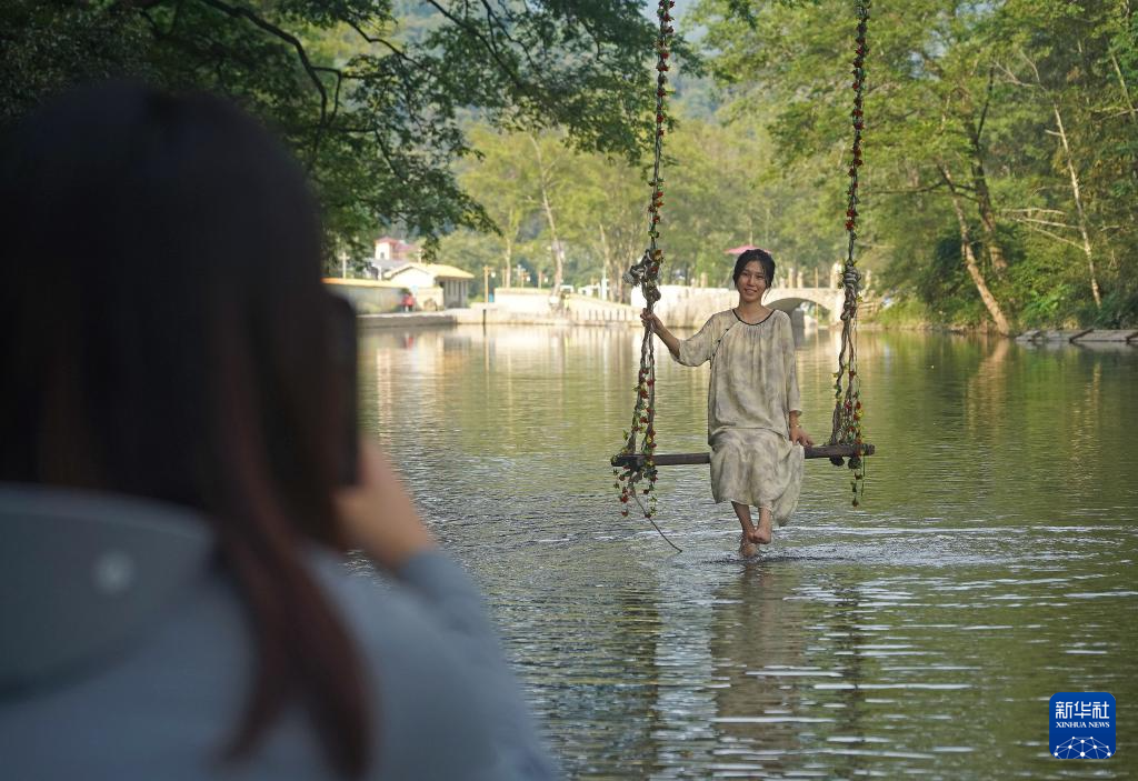 游客在港背村的网红水上秋千打卡留影(8月24日摄)。新华社记者 万象 摄pagebreak
