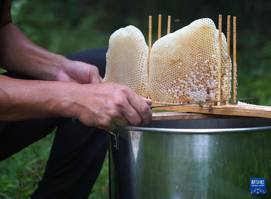 村民刘煌平在收获蜂蜜(8月24日摄)。新华社记者 万象 摄pagebreak