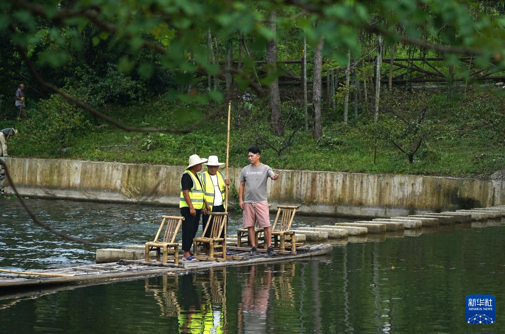 筏工包信焱(左一)带游客体验竹筏漂流(8月24日摄)。新华社记者 万象 摄pagebreak
