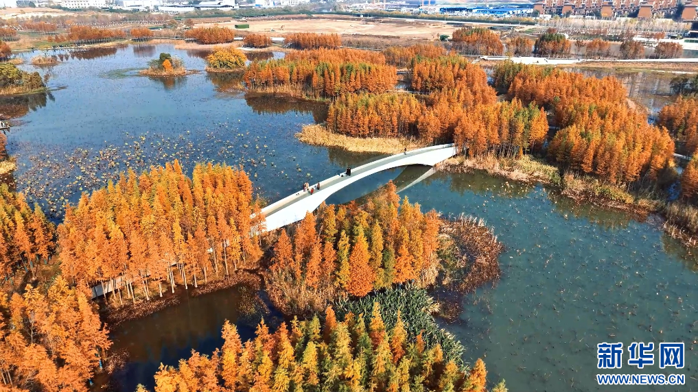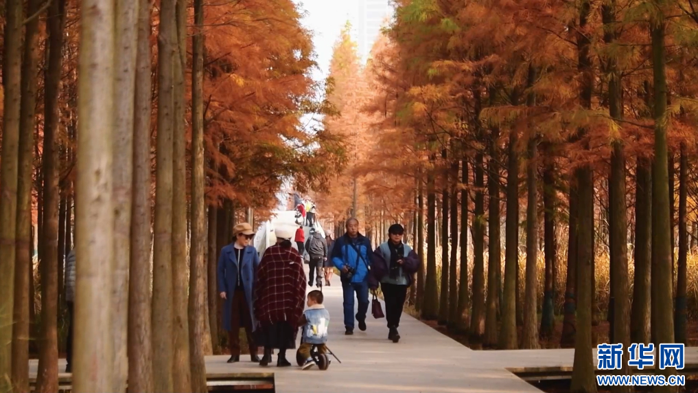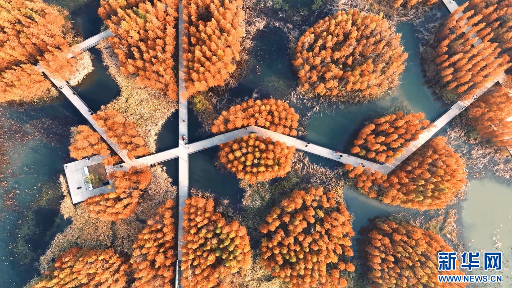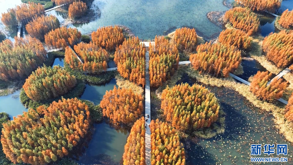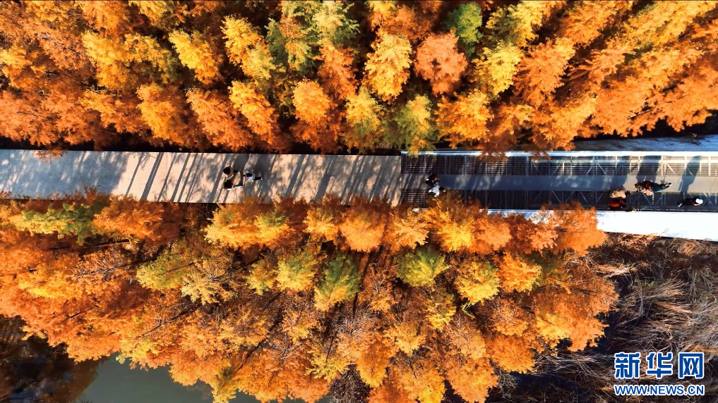 近日,在江西南昌高新区的“网红打卡地”鱼尾洲公园,成片水杉树叶褪去青翠,换上“新装”。在无人机镜头下,色彩斑斓的水杉与一湖清水交相辉映,游客漫步其中尽享冬日浪漫。(熊卓青 魏文康)