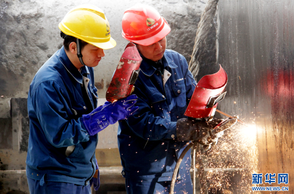 黄发明(右)在进行焊接作业。新华网发春节假期过后,在江铜德兴铜矿铲装工段的露天维修场,黄发明正忙着和同事对几台电铲铲斗进行维修保养。“春节期间,采矿作业不停工,大家轮流值班,做好保障工作。”黄发明所在的铲装工段,除了做好日常的设备保养之外,还是一支“救火队”。无论寒冬酷暑还是白天黑夜,一旦设备在采矿场出现问题,他们就要第一时间赶到现场解决,不能耽误生产进度。