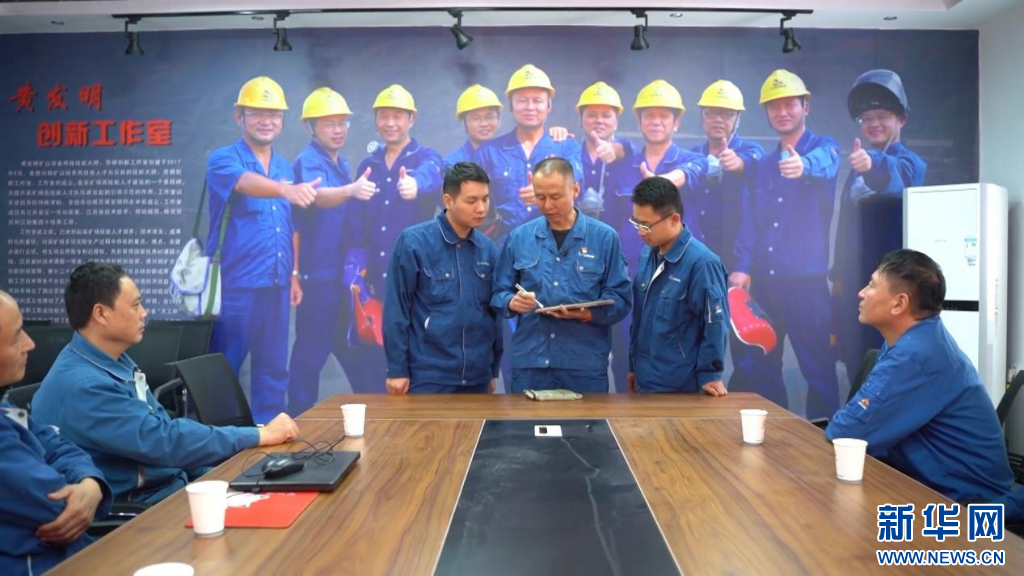 黄发明创新工作室的成员在一起研讨。新华网发都说电焊工是个苦差事,但黄发明一干就是34年。“既然做了这份工作,就要将它做到极致。”带着这份初心,黄发明逐渐成长为出色的“疗伤专家”。面对三四层楼高的矿场设备,他手握焊枪,施展出“绣花功夫”,以精湛的技艺修复隐患,做到“手到病除”。在黄发明和工段同事们的努力下,德兴铜矿的各类采矿设备的开动率和生产效率大幅提升。