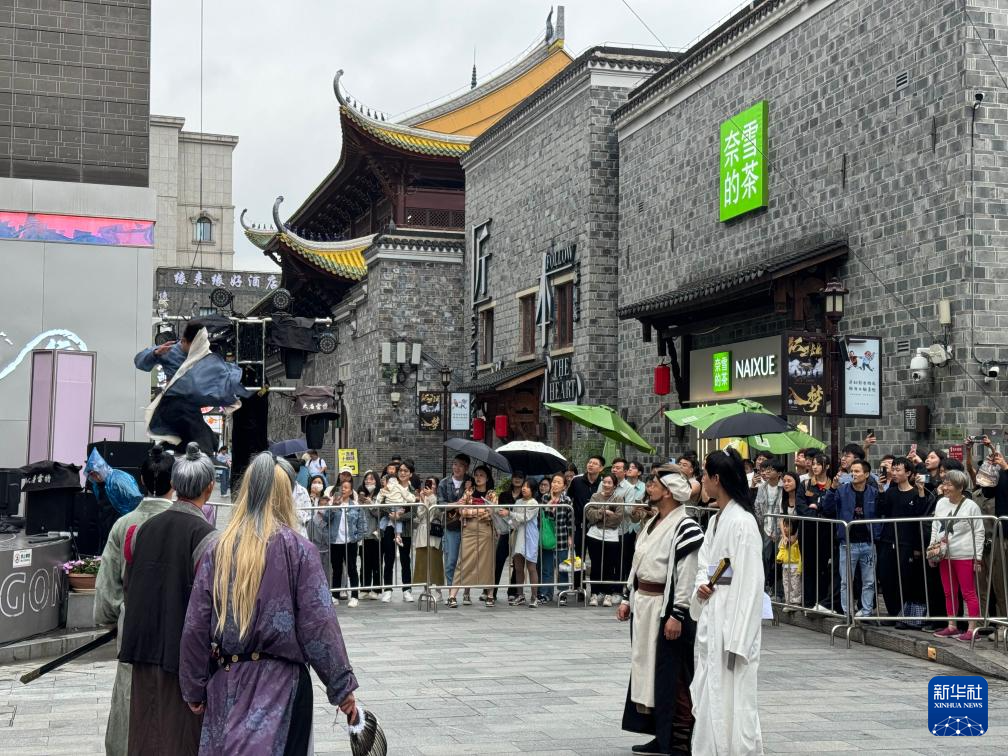 “今年恰逢金庸先生百年诞辰,‘五一’又伴随高校毕业季而来,毕业生们就像初入江湖的少侠。于是,我们以金庸武侠小说名场面为蓝本,打造了这场全民英雄会。”谈起创意的来源,万寿宫历史文化街区活动主管高俊解释说,他们还为毕业生准备了摊位,供其展出毕业作品,秀出才华巧思。
