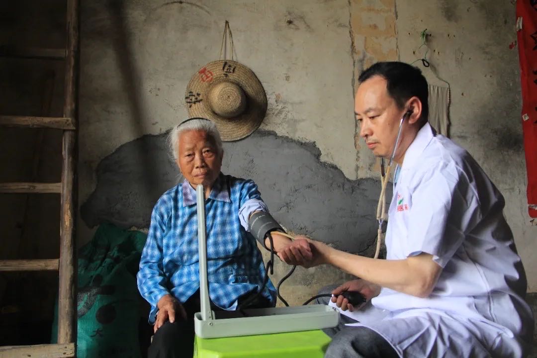 ▲黄月明上门为赖村村81岁的谭有秀进行健康体检。