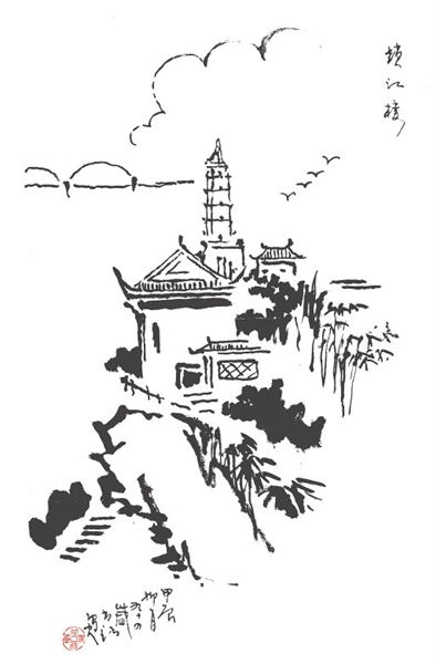 ▲7月11日,94岁高龄的九江市博物馆退休干部陈尚秋在家创作以锁江楼塔为主题的画作。