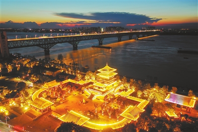 ◀7月30日,晚霞下的琵琶亭灯火璀璨,让人仿佛穿越千年,体验到“浔阳江头夜送客”的梦幻场景。
