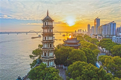 7月12日,位于九江市浔阳区的锁江楼塔巍然矗立在长江岸边,古老的楼塔在朝阳的映照下绽放出迷人光彩。