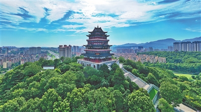 位于九江市濂溪区的德化楼与远处的庐山、近处的城市相互映衬,构成一幅动人图景。