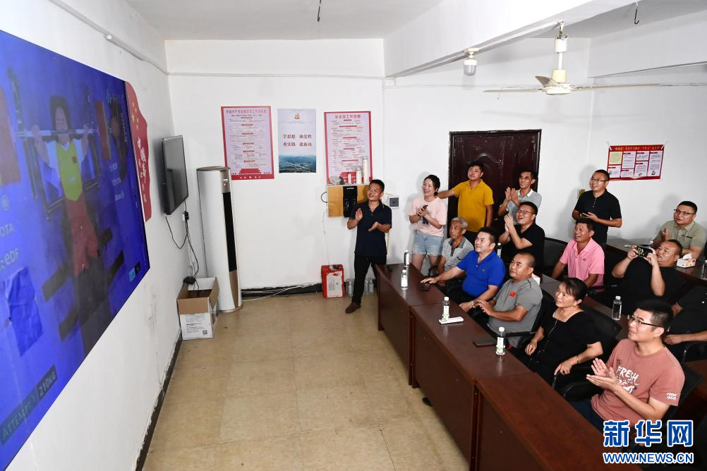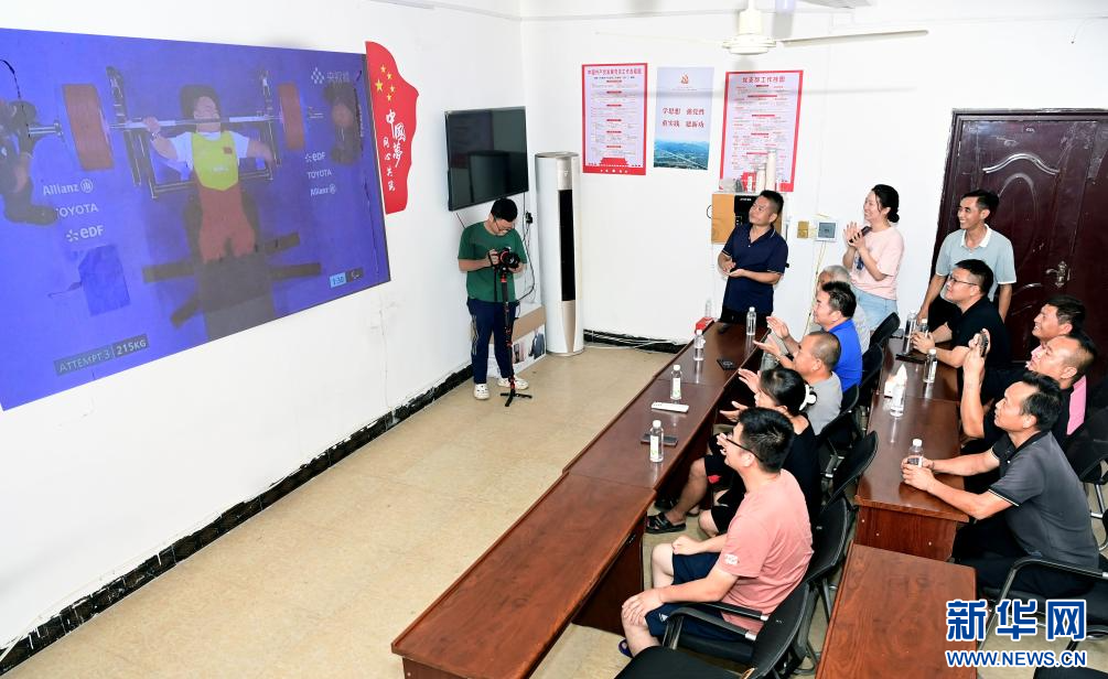 在江西万载籍举重运动员邹益的家乡,邹益的父母和乡亲好友齐聚村委会的大屏幕前观赛。新华网发 邓龙华 摄