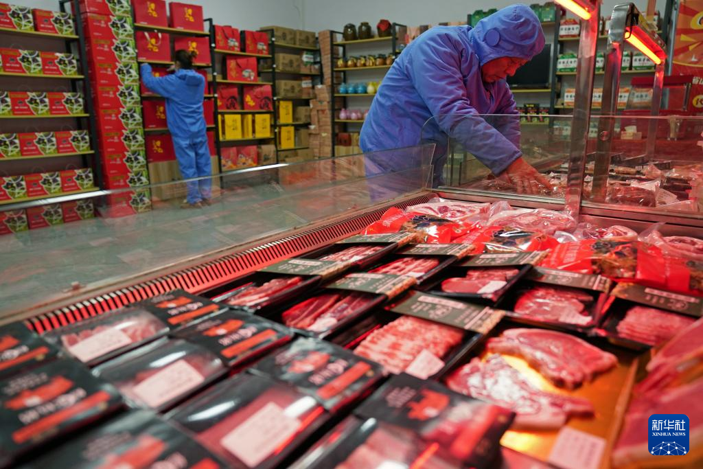 在位于江西省修水县港口镇红苏村的幕村杭猪加工基地,在基地工作的村民在摆放猪肉制品(12月3日摄)。新华社记者 万象 摄pagebreak