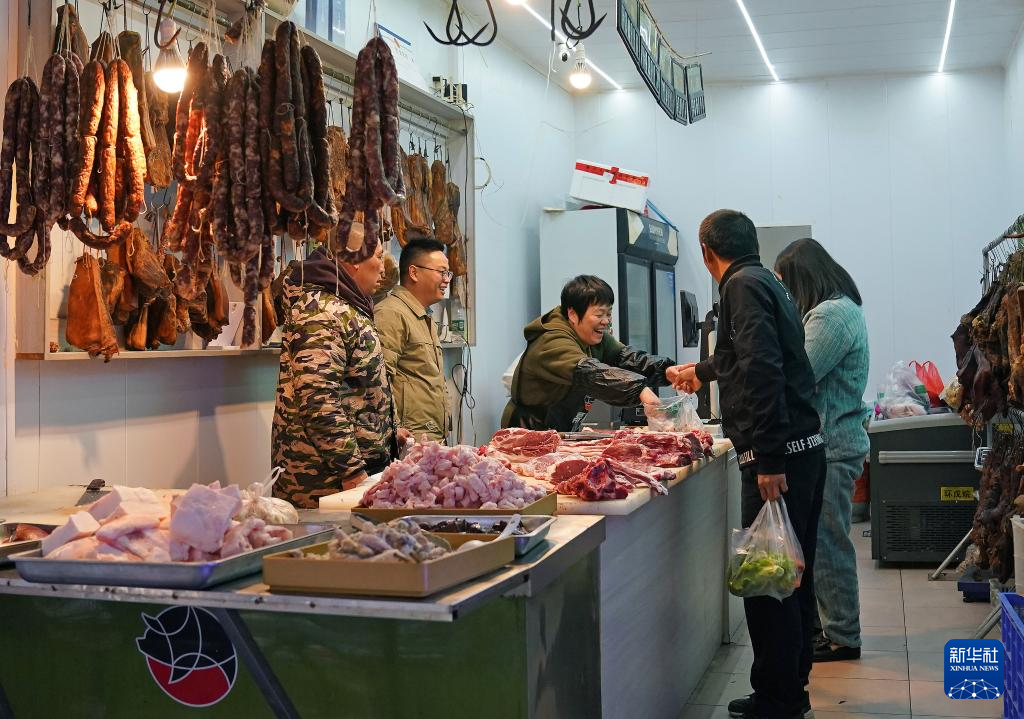 卢丹(左二)在江西省修水县县城的一个幕村黑花猪直销店查看销售情况(12月4日摄)。新华社记者 万象 摄