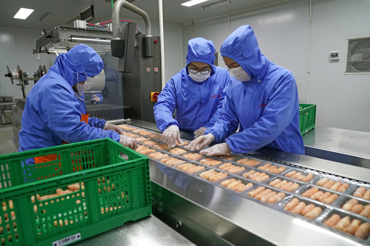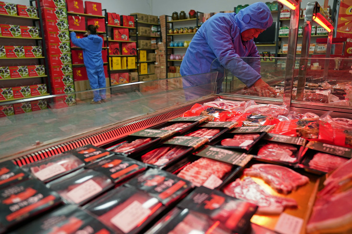 在位于江西省修水县港口镇红苏村的幕村杭猪加工基地,在基地工作的村民正在摆放猪肉制品(12月3日摄)。