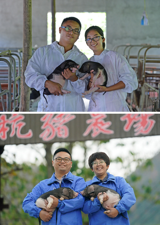 拼版照片:上图是卢丹(左)、邹玲丽抱着猪仔在当年创业的猪舍里合影(2015年7月31日摄);下图是卢丹(左)、邹玲丽抱着猪仔在现在的幕村杭猪生态农场门口合影(2025年12月3日摄)。组图均由新华每日电讯记者万象 摄