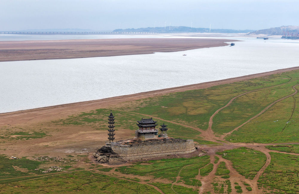 鄱阳湖水位下降,湖区的千年石岛落星墩完全展露出来(2025年12月13日摄,无人机照片)。新华社发(韩俊烜 摄)