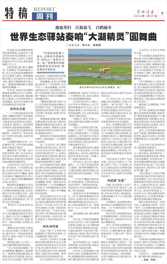 近年来,国际社会对鄱阳湖湿地画像的关注与日俱增。呦呦鹿鸣、豚跃浪激、雁起鹤翔,汇聚成人与自然和谐共生的圆舞曲,也成为中国践行绿色发展理念的生动注脚。