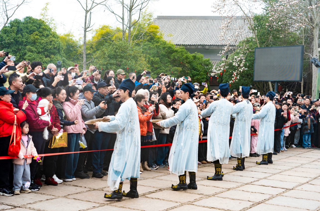 仪式在悠扬的古乐声中开启,身着汉服的“嫦娥仙子”翩翩起舞,重现了嫦娥奔月的动人传说。 随后,工作人员从千年温汤古井中汲取热气腾腾的温泉水,现场分发给游客洗手、点额,寓意洗去旧岁尘埃,迎接新年福运。