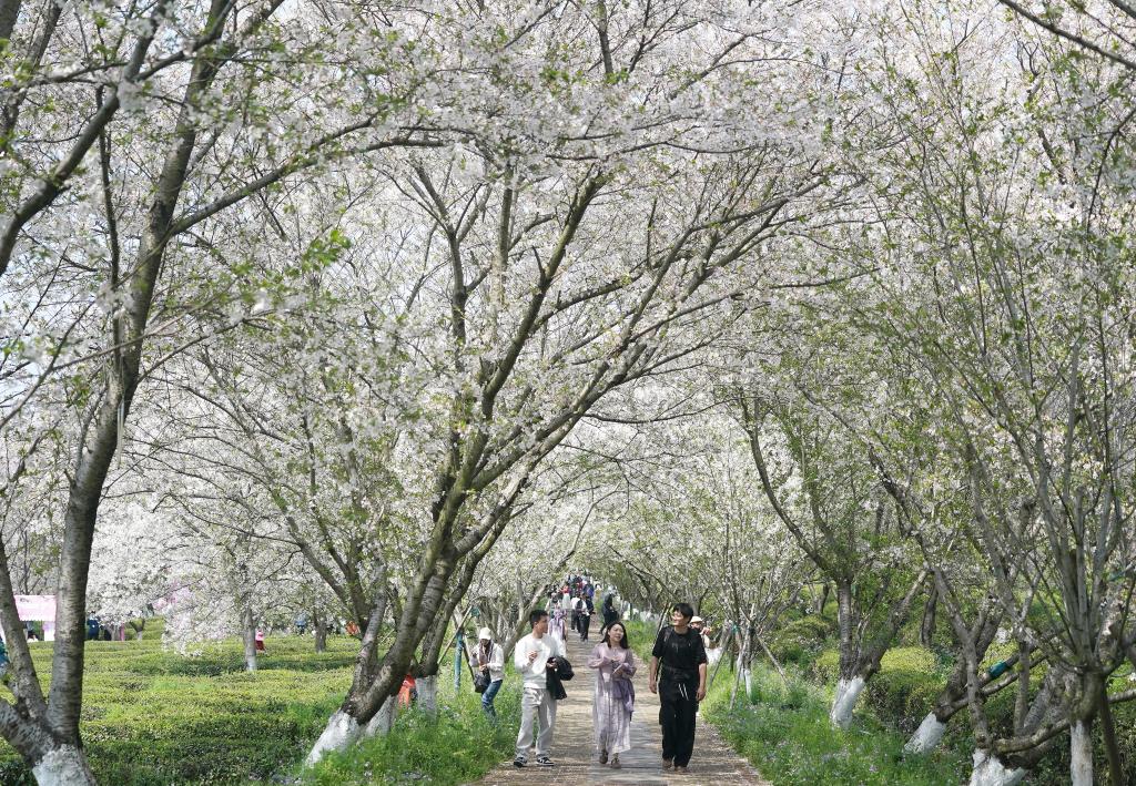 近日,江西省南昌县凤凰沟景区樱花进入盛花期。景区2000余亩樱花谷内,早樱、晚樱、迎春樱等20余个品种樱花次第绽放,春风拂面,花海连片,吸引不少游客前来赏花踏青。新华社记者 万象 摄