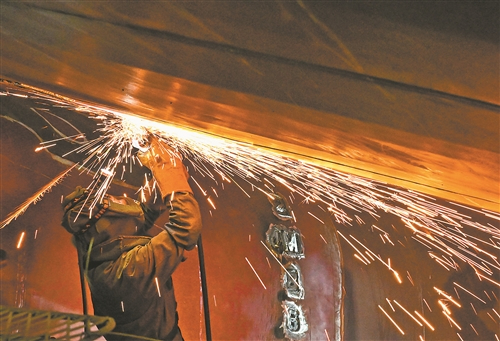 2025年9月18日晚,工人在打磨船体上的焊缝。